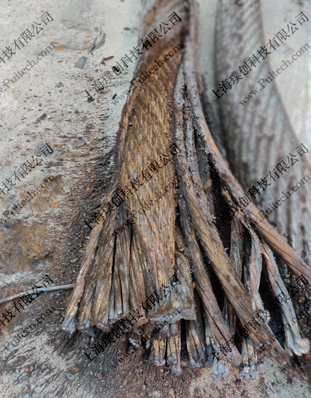 2.通過檢測后確認銹蝕部位,前端出現銹蝕的鋼絲繩去掉,以確保鋼絲繩的**使用。