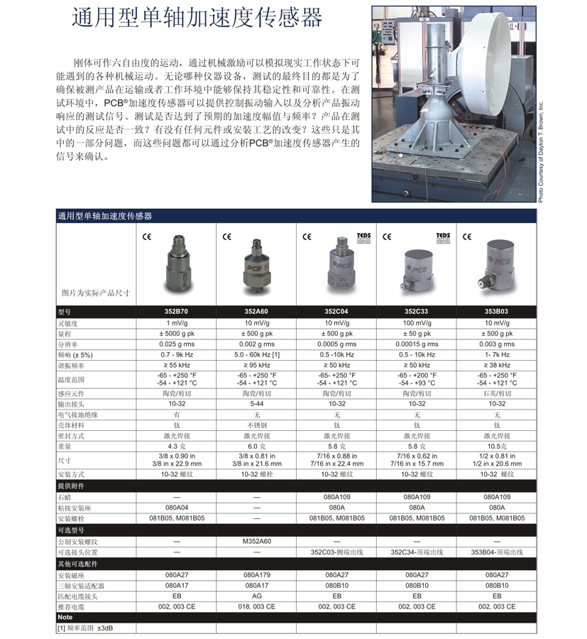 PCB Piezotronics制造精密型振動加速度計以滿足振動、沖擊、加速度測量和運動監測、控制和測試應用。PCB Piezotronincs提供ICP、PE、MEMS和電容傳感技術用于實現各種各樣的測量要求。PCB生產的加速度計有單軸、雙軸和三軸可選。這些產品用于工廠生產和設計人員以及研發組織的現場測試,從來獲取關鍵數據。除精密小型傳感器外,PCB的IMI部門還提供堅固的加速度計和振動傳感器用于工業機器振動監控。由于不同的測試和工業環境有不同的安裝條件,所以PCB制造的加速度計具有各種不同的靈敏度、溫度、頻率響應、振幅響應、外形和引線的接地配置以滿足不同的需求。加速度計來評估設備或結構性能的關鍵因素,因此,這樣的應用通常需要整個測量系統的校準證明,從傳感器到*終的輸出。美國PCB加速度傳感器352C33的每個傳感器出貨時都隨貨附帶一個可溯源到NIST的校準證書。