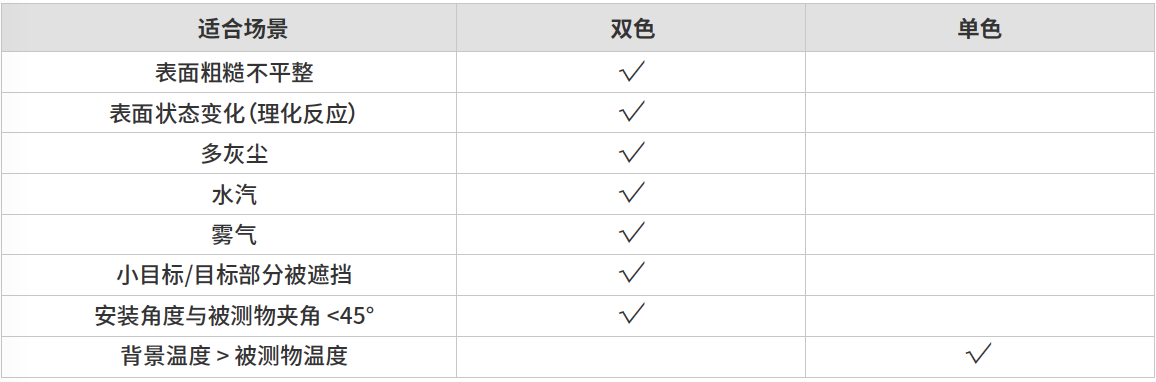 水汽等影響因素不敏感,在復雜苛刻的工業(yè)場景下依然可以獲得較高的測溫準確度。不同場景的選型推薦如下: